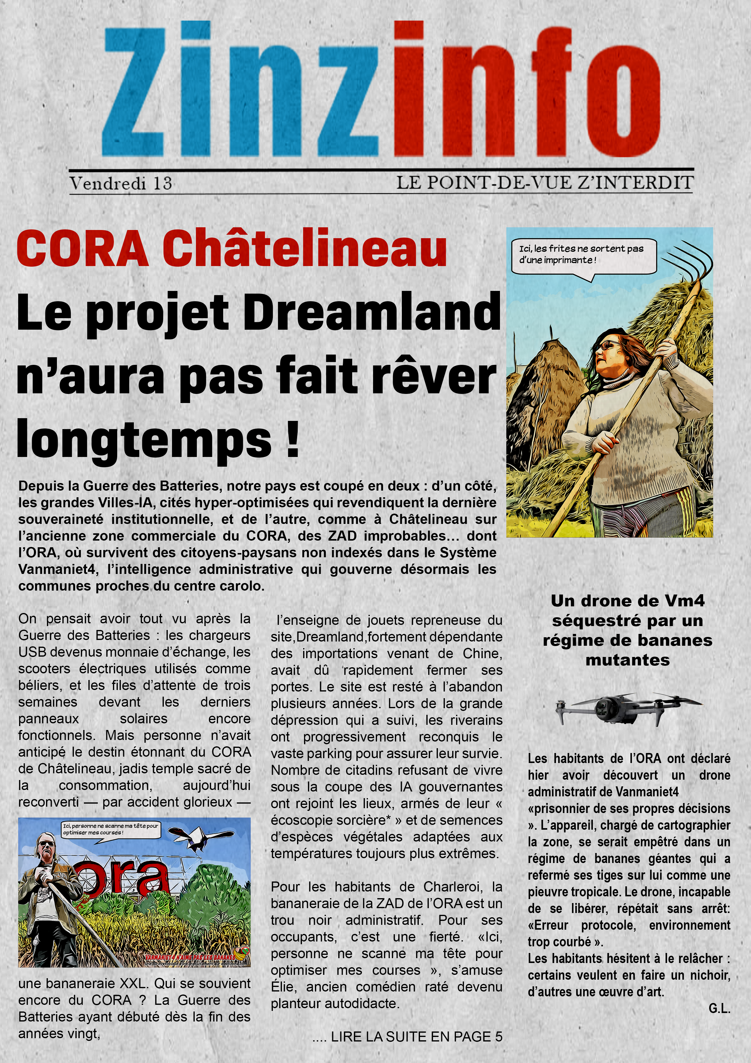Bonjour, Nous sommes les participants de l atelier multimédia du Gsara au sein de notre Habitat Groupé Solidaire à Couillet. Nous fabriquons une BD d aventure dont l action se passe sur le territoire carolo dans un monde post-crise énergétique. Nos héros vivent désormais sur le parking du Cora transformé en champs et plantation de bananes. Ils sont exclus du territoire de la ville qui, elle, est régie par une Intelligence artificielle qu ;administre le tout-puissant CPAS. Ainsi en va-t-il de toutes les villes d Europe qui ont survécu aux grandes crises des années 2030 ....